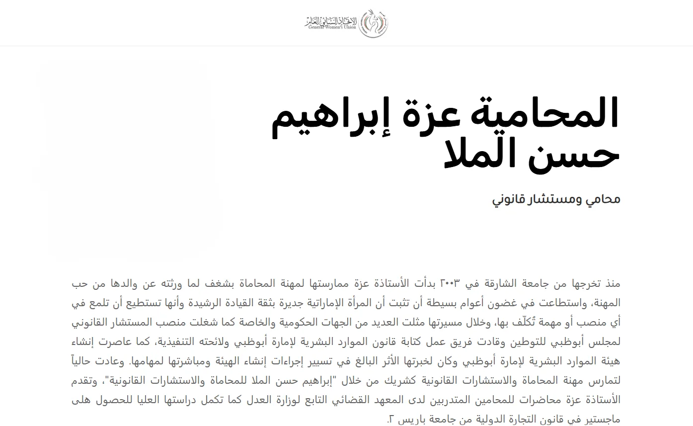 صفحة رسمية تعرض السيرة الذاتية للمحامية عزة الملا ضمن بوابة المرأة الإماراتية الرسمية.
